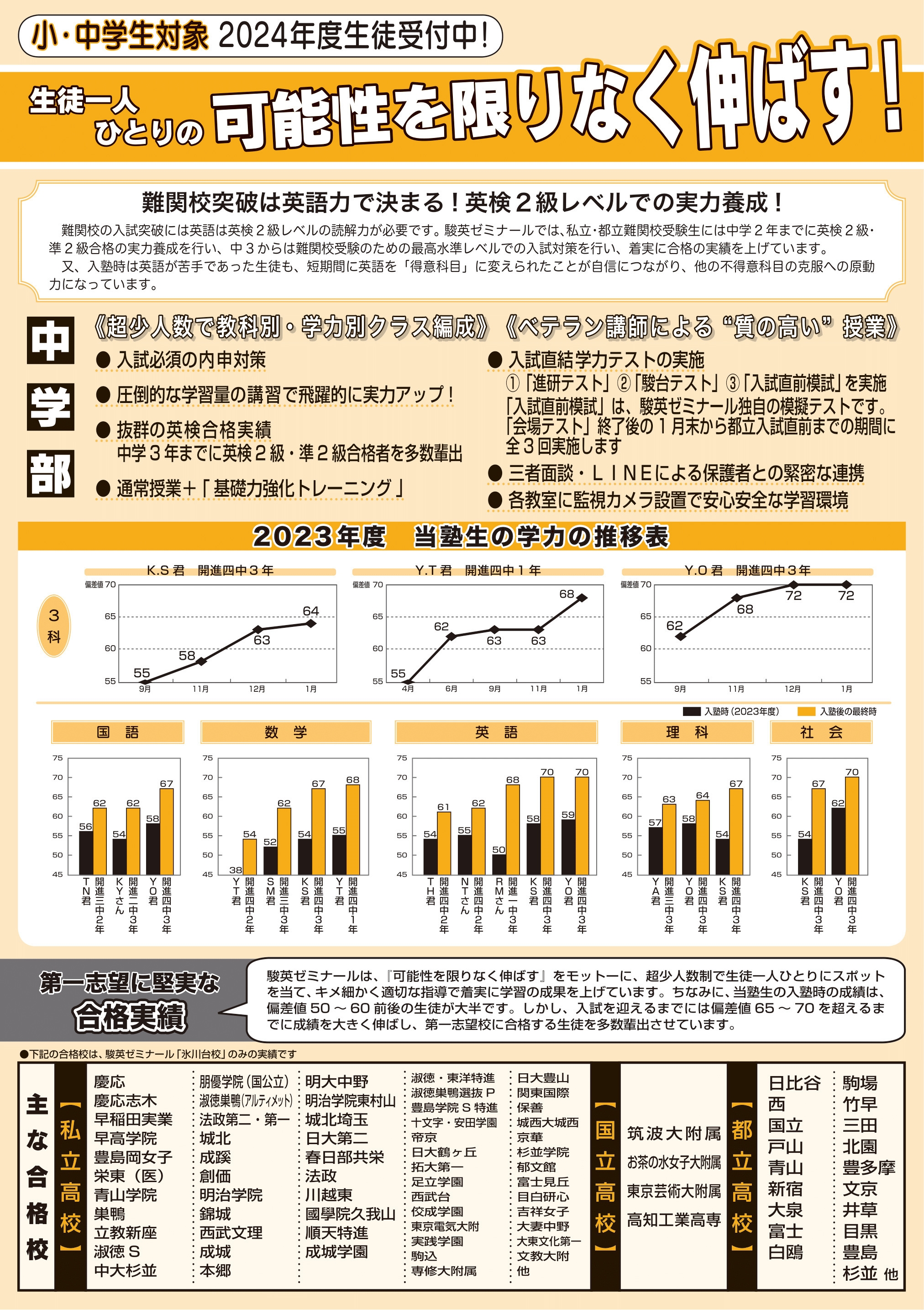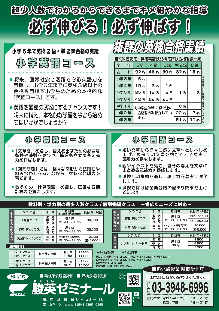駿英ゼミナールでは、私立・都立難関校の受験者には“学年の枠”を超え、中学2年までに英検2級・準2級合格の実力を養成し、中学3年からは難関校突破のために最高水準レベルでの徹底した入試対策を行い着実な合格の実績を上げています。